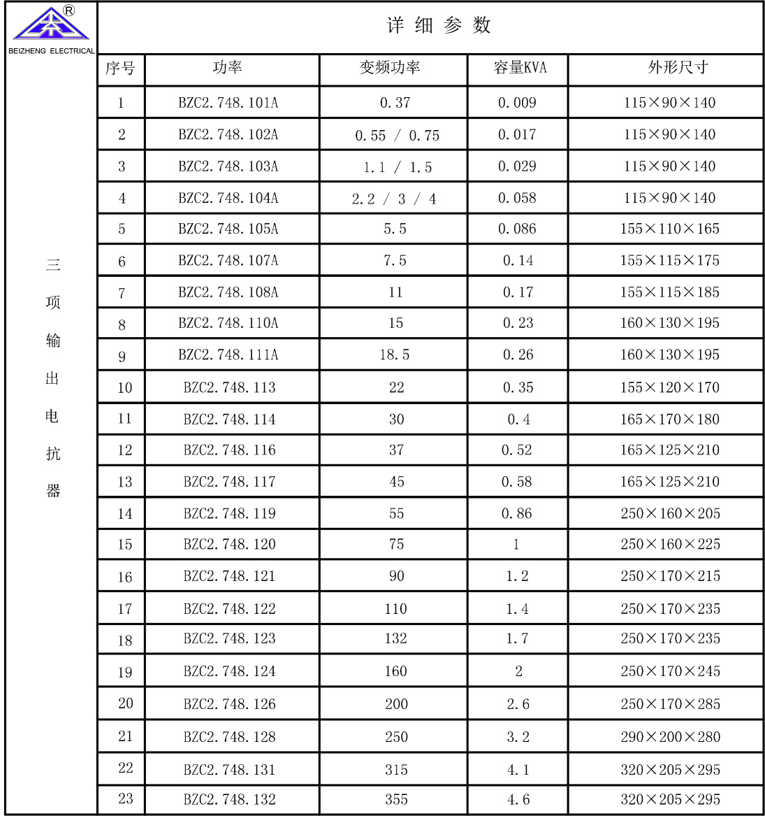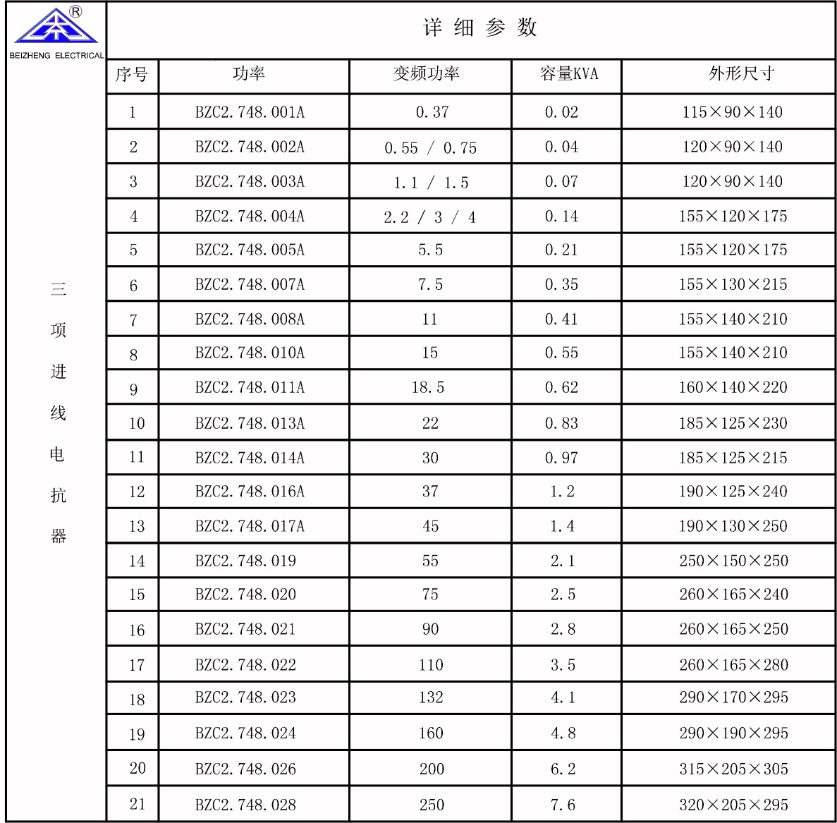 進線/輸出電抗器選型表